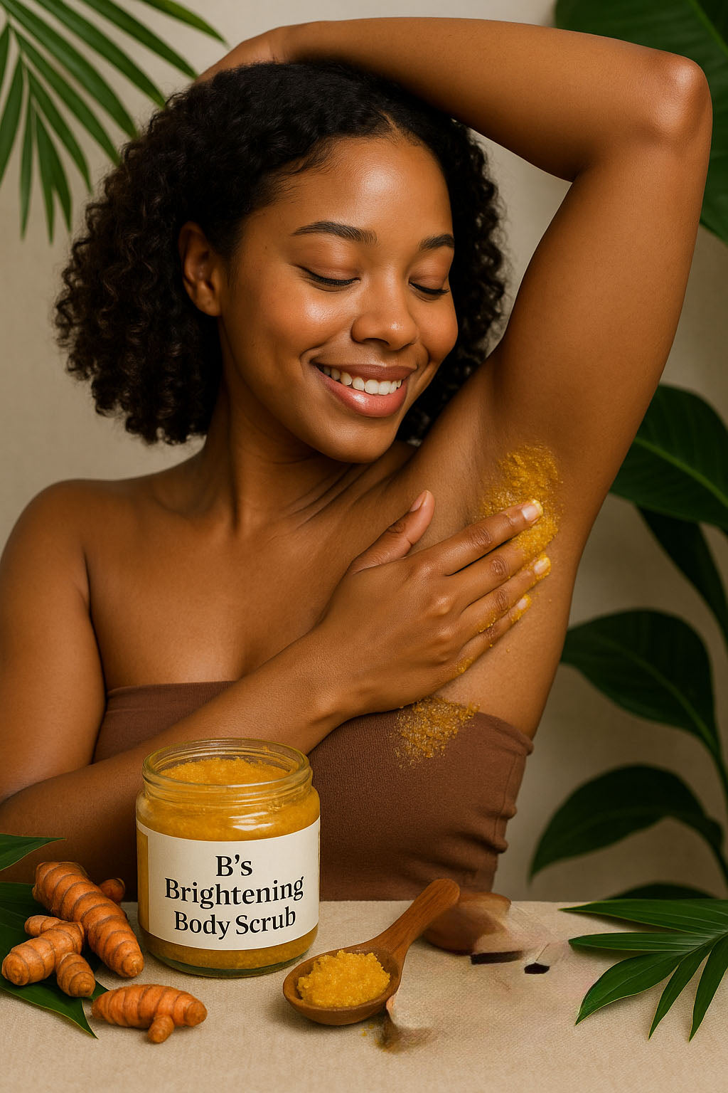 B’s Brightening Body Scrub is an all-natural turmeric-based exfoliant crafted to gently fade dark spots, smooth uneven texture, and restore your skin’s natural glow. Specifically designed with melanin-rich skin in mind, this luxurious scrub helps brighten areas such as underarms, inner thighs, elbows, and knees—without harsh chemicals or irritation.